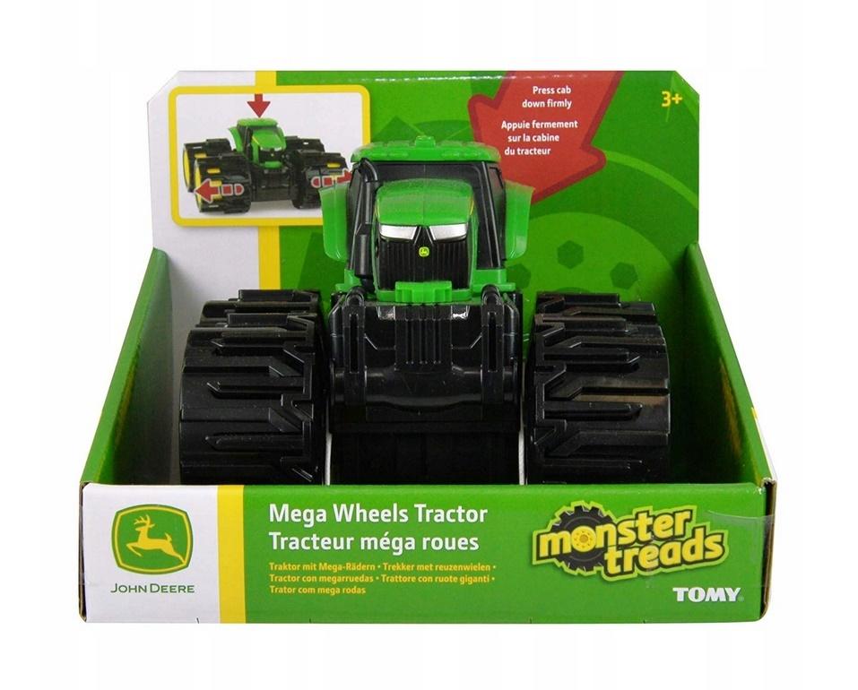 Plastikowy traktor firmy John Deere z ogromnymi oponami które można dodatkowo rozszerzyć. Zabawka dla dzieci w wieku od 3 lat.
