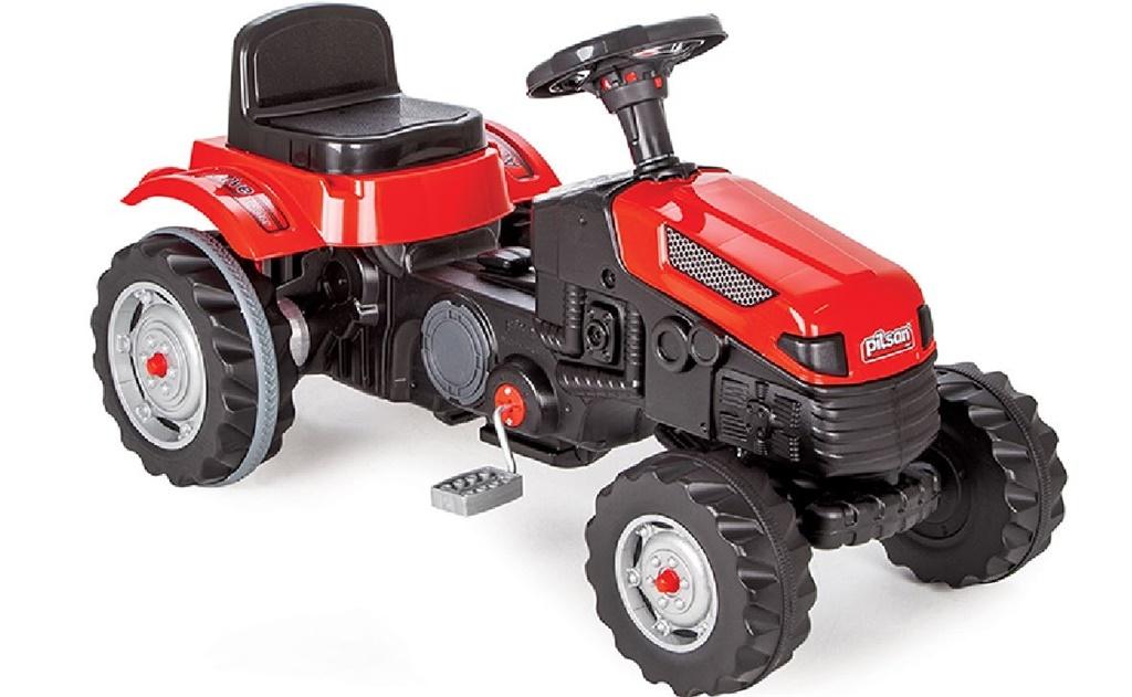 Traktor na pedały, regulowane siedzenie: przód, tył, klakson, hak, napęd łańcuchowy, dopuszczalne obciążenie 50 kg, 2 kolory: zielony, czerwony, wymiary traktora: 95 x 51 x 51 cm.