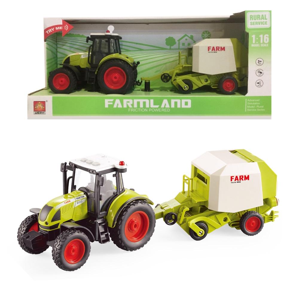 Traktor w skali 1:16 z prasą rolującą Traktor z dźwiękiem i światłami, zasilanie 3xAG13 (dołączone) Wymiary: 38.5 x 10 x 12.5 cm Wymiary opakowania: 42 x 12 x 19 cm
