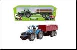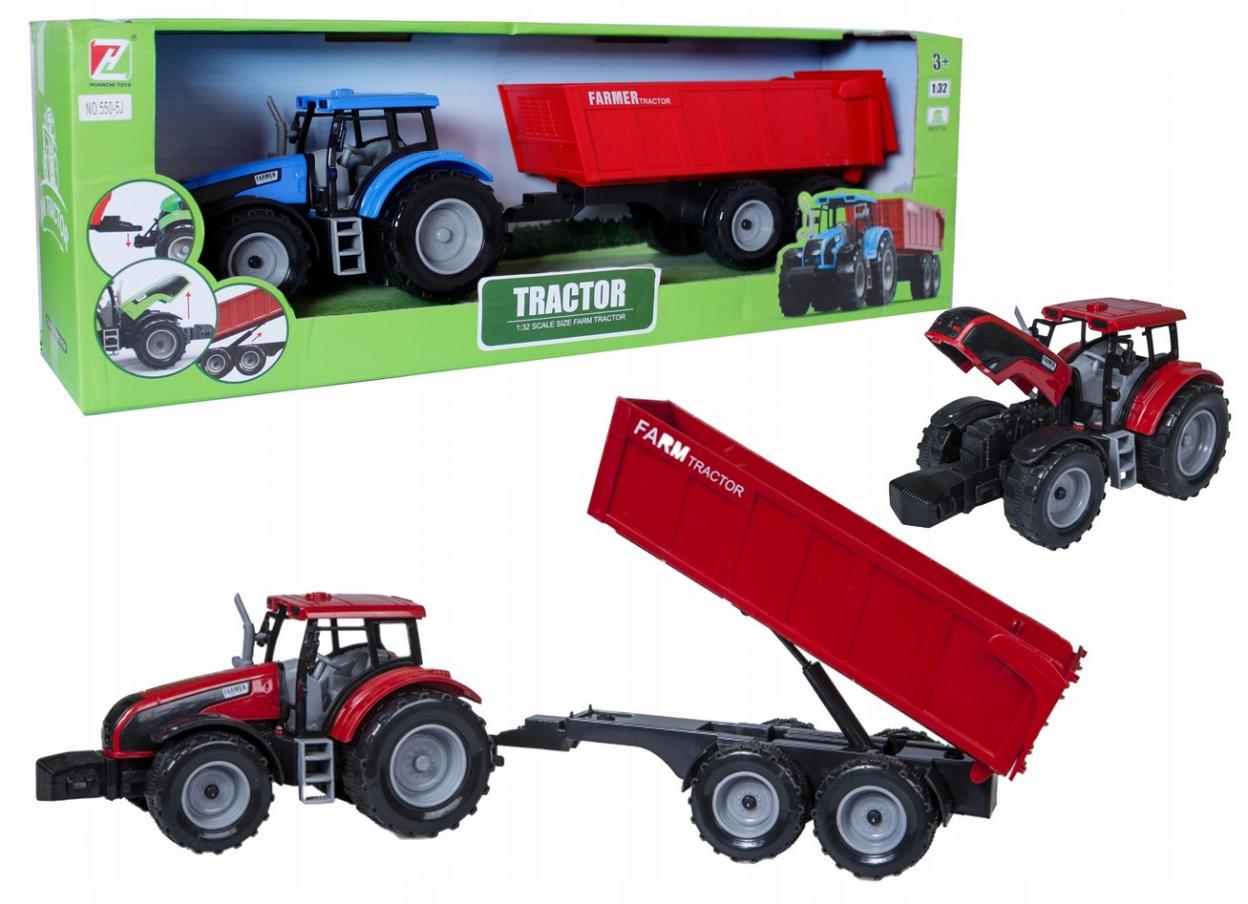 Traktor z przyczepą - podnoszona maska, traktor - 22 cm, przyczepa - 24 cm, 3 kolory: czerwony/niebieski/zielony.
