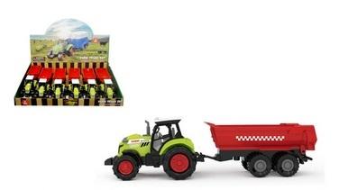 Plastikowy traktor z przyczepą. Pojazd świeci światełkiem oraz wydaje dźwięki: zapalania silnika. Zabawka działa na baterie typu AG13. Baterie znajdują się w zabawce. Zabawka dla dzieci od 3 lat.