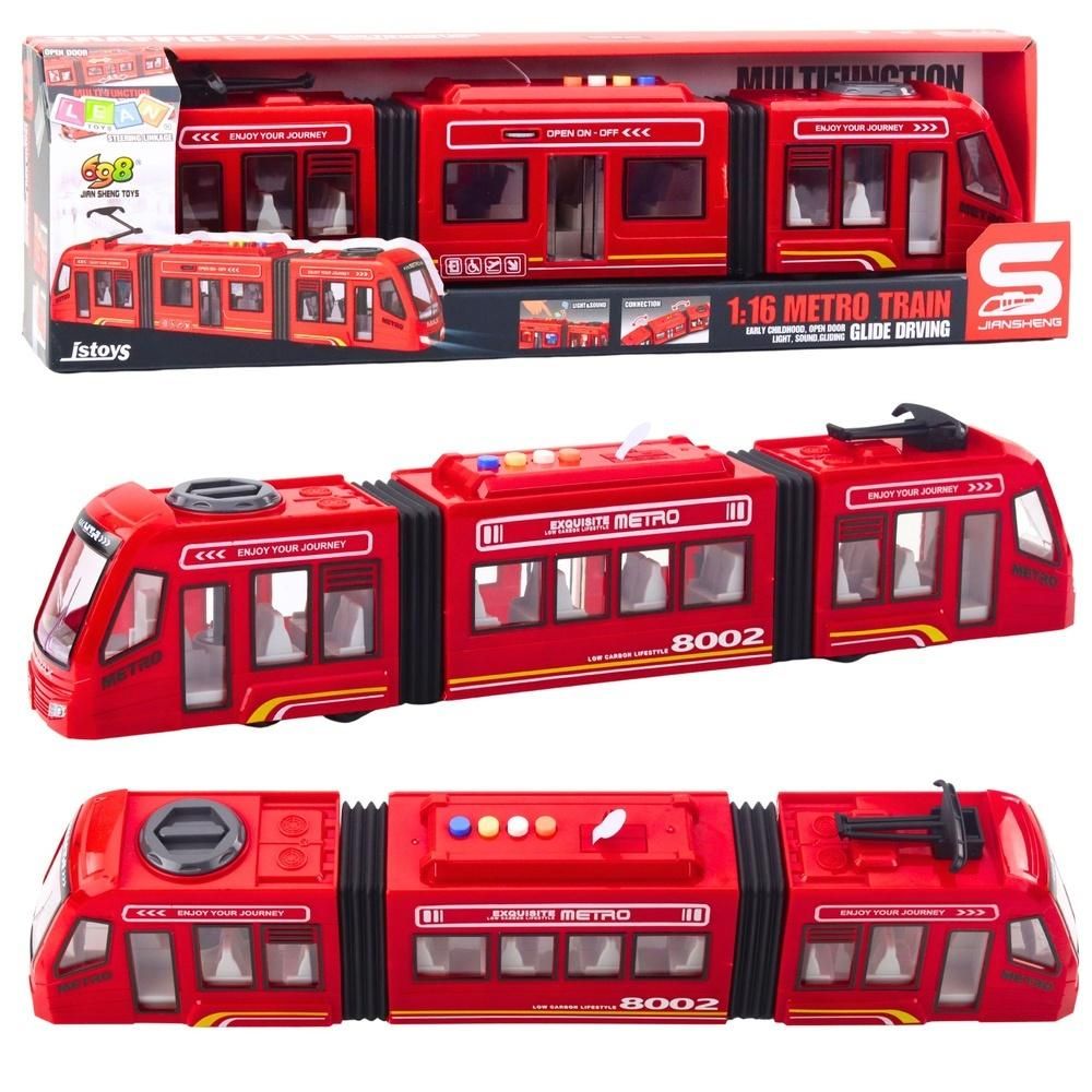 CZERWONE METRO 1:16 Z EFEKTAMI ŚWIETLNYMI I DŹWIĘKOWYMI Model miejskiego metra w skali 1:16 to realistycznie odwzorowany pojazd szynowy, który zachwyci każdego fana transportu publicznego. Klasyczny czerwony kolor, przeszklone okna oraz starannie wykonane detale nadają pojazdowi charakteru prawdziwego pociągu znanego z miejskich linii metra. Zabawka została wykonana z wysokiej jakości tworzywa i posiada liczne funkcje, które angażują dziecko do aktywnej i kreatywnej zabawy. Metro wyposażone jest w efekty świetlne i dźwiękowe, które uruchamiane są za pomocą przycisków na dachu. Symulują one realistyczne odgłosy jazdy oraz migające światła, co uatrakcyjnia każdy przejazd. Ruchome przeguby pozwalają metru poruszać się na zakrętach i manewrować jak prawdziwy pojazd wieloczłonowy. Dodatkową atrakcją są otwierane drzwi, dzięki którym zabawa staje się jeszcze bardziej realistyczna - można "wsiadać" i "wysiadać" z wagonu. Zestaw idealnie nadaje się zarówno do zabawy na podłodze, jak i jako efektowny model do kolekcji. Dzięki dużej skali, model robi wrażenie i przyciąga wzrok intensywną kolorystyką oraz ruchomymi elementami. SPECYFIKACJA: Wymiary metra: 41 x 8,5 x 6,5 cm Wymiary opakowania: 44 x 13 x 8,5 cm Materiał: Tworzywo sztuczne Kolor: Czerwony Skala: 1:16 Efekty dźwiękowe: Tak Efekty świetlne: Tak Funkcje: Otwierane drzwi, ruchome przeguby, przyciski na dachu ZAWARTOŚĆ ZESTAWU: Model metra 1:16 Oryginalne opakowanie