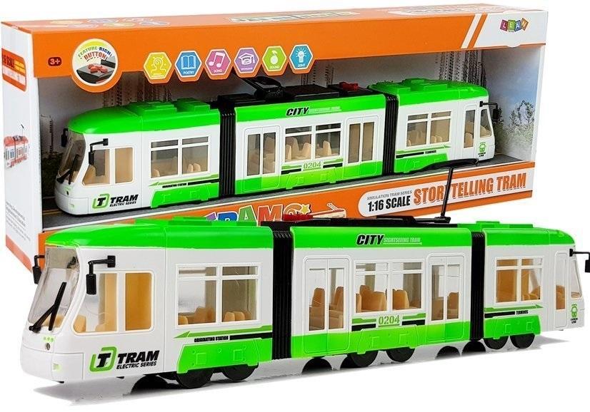 Tramwaj Wycieczkowy na Baterie 46 cm Dźwięki i Świtała 1:16 Zielony Kolej w miejskim wydaniu czyli pojazd szynowy wożący pasażerów na krótkich miejskich odcinkach. Podróż tramwajem dla młodego obywatela może być równie fascynująca co podróż pociągiem. Pozwól dziecku stać się motorniczym, który zawiezie swoich pasażerów dokładnie tam gdzie chcą, niech maluch rozwija wyobraźnię! Po naciśnięciu trójkątów włączają się odgłosy jadącego pociągu, zapalają się światła w pociągu w kolorze czerwonym, zielonym i niebieskim oraz białe światła z przodu i tyłu a pociąg jedzie do przodu lub do tyłu (w zależności który guzik naciśniemy). Gdy naciśniemy kwadrat, wewnątrz pociągu zaświecą się światła w kolorze czerwonym zielonym i niebieskim, a głos zapowie przyjazd pociągu. Po naciśnięciu okrągłego guziczka usłyszymy wesołą melodyjkę, a wnętrze pociągu rozbłyśnie kolorami. Pojazd posiada podnoszony pantograf. Wymiary tramwaju: 46 cm x 7.5 cm x 10 cm Wymiary pudełka: 53 cm x 20 cm x 9 cm Tramwaj zasilany jest trzema bateriami AA 1.5V (brak w zestawie). Zabawka posiada certyfikat CE i jest zgodna z normą EN 71. Zapakowana jest w pudełko, dzięki czemu idealnie nadaje się na prezent.