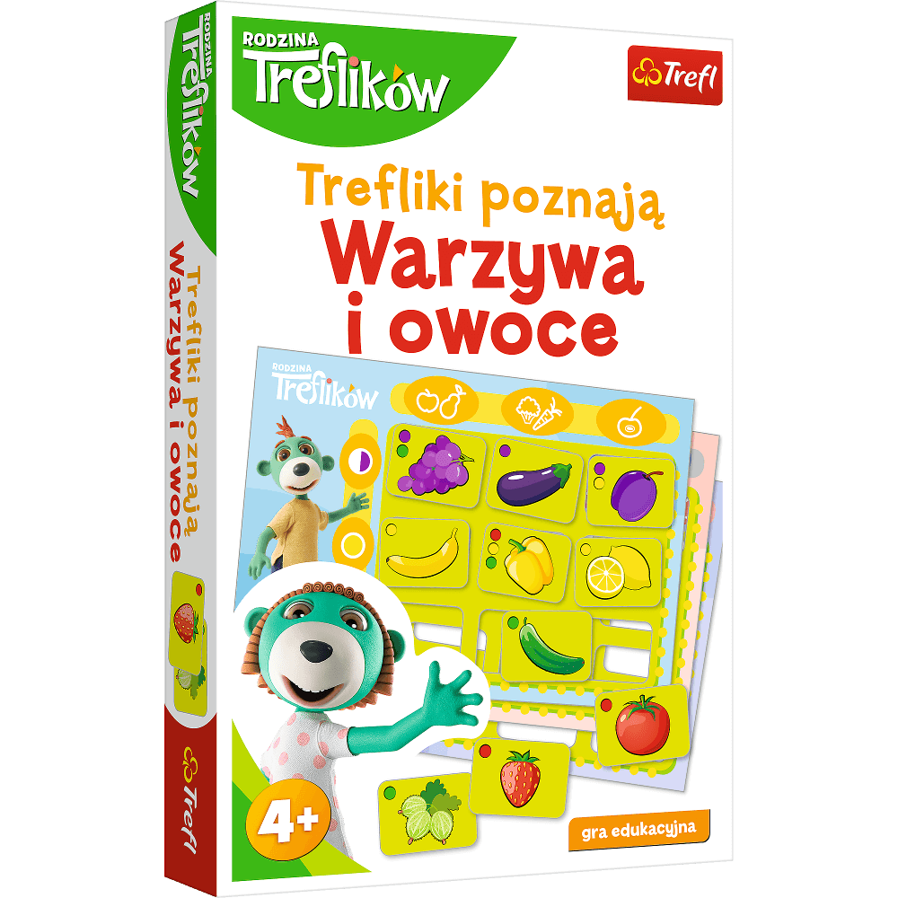 Trefliki poznają: Warzywa i owoce to gra edukacyjna, która w zabawny sposób pomaga poznać warzywa i owoce. Ćwiczy zdolności poznawcze, spostrzegawczość i logiczne myślenie. Pomaga również rozwijać słownictwo i ćwiczy koncentrację. Do gry dołączone są propozycje zabaw. Produkt polecany dla dzieci od 4 roku życia.