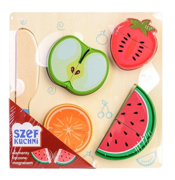 Zestaw "Szef kuchni" rozwija wyobraźnię, kreatywność oraz motorykę dziecka. Zabawa zestawem daje możliwość poznania owoców, warzyw i przekąsek, zachęca do gotowania oraz nauki o zdrowym odżywianiu. Wszystkie elementy wykonane są z drewna, pokryte bezpieczną dla dzieci farbą. Elementy połączone magnesem.