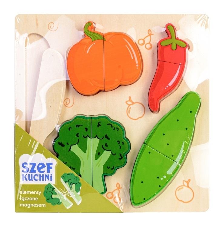 Zestaw "Szef kuchni" rozwija wyobraźnię, kreatywność oraz motorykę dziecka. Zabawa zestawem daje możliwość poznania owoców, warzyw i przekąsek, zachęca do gotowania oraz nauki o zdrowym odżywianiu. Wszystkie elementy wykonane są z drewna, pokryte bezpieczną dla dzieci farbą. Elementy połączone magnesem.
