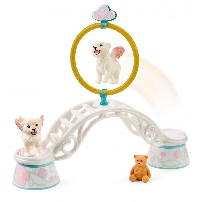 Podczas treningu dla uskrzydlonych lwiątek dużo się dzieje w krainie Bayala. A to dlatego, że te dwa małe lwy chcą jak najszybciej majestatycznie latać w przestworzach. Ale ich skrzydła są jeszcze małe. Na razie trenują swoje umiejętności lotnicze na ziemi podczas zabawy. Do tego celu mają arkę z dwoma podestami oraz pierścień, przez który mogą przebiegać, skakać lub latać. Ale to nie wszystko: jedną łapą lwiątka mogą wszystko obracać i przekształcać w huśtawkę, która zapewni im radosne huśtanie i szaleńczą zabawę. Kiedy ćwiczą swoje sztuczki, zdarza się wiele zabawnych rzeczy i czasami lwiątko wypada z koszyczka. Cała Bayala słyszy wówczas ich radosne miauczenie i jest zachwycona uroczymi skrzydlatymi kotkami.