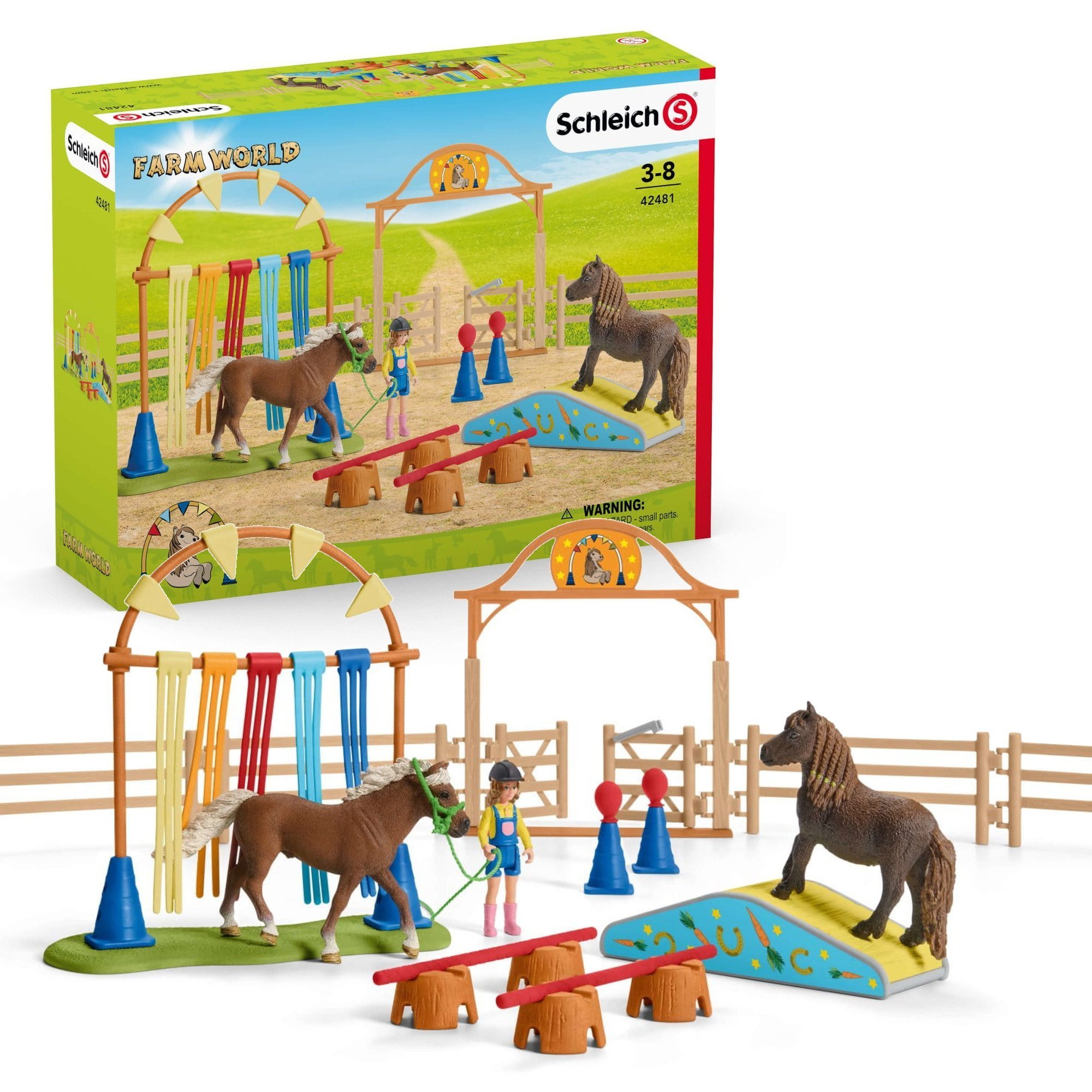 figurka klasycznego kucyka, figurka kuca szetlandzkiego, figurka dziewczynki, kask do jazdy konnej, uzda, lina do prowadzenia, brama wjazdowa, 8 elementów wybiegu, huśtawka, 4 słupki treningowe, 4 przeszkody z pnia drzewa, 2 słupy, 2 balony, płyta podstawy, brama, 4 proporczyki, poprzeczka, 5 zasłon z frędzli, arkusz naklejek.
