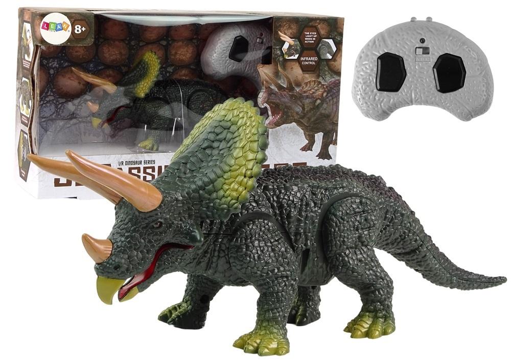 Zabawka jest doskonałym odwzorowaniem ogromnego dinozaura, żyjącego około 125 - 100 milionów lat temu. Wykonany jest w kolorze naturalnym zbliżonym do autentycznego umaszczenia wielkich gadów. Chodzący dinozaur może być nie tylko rewelacyjną zabawką - sprawdzi się również w roli pomocy naukowej. Przeniesie malucha w świat dinozaurów i Jurajskiego Parku. Rozwinie wyobraźnie malucha oraz pozwoli poznać fakt związane z prehistoria i mitycznymi stworzeniami. Triceratops idealnie przypomina prehistorycznego gada, jego pancerz, łuski są odwzorowane z najmniejszym szczegółem. Po włączeniu oczy się rozjaśniają i świecą w kolorze czerwonym. Ruchy wyglądają bardzo realistycznie. Super zaletą jest zdalne sterowanie na podczerwień. Dwa przyciski pomogą poruszać się w przód, rusza głową, paszczą i łapami. W trakcie zabawy wydaje charakterystyczne dźwięki dinozaurów. Pilot do sterowania przedstawia kształtem kamień, ciekawie wygląda i prezentuje się na półce małego odkrywcy prehistorycznych stworzeń. Każdy mały fanatyk dinozaurów, ucieszy się z takiego prezentu. Wymiary dinozaura : 23 cm x 5 cm x 10 cm Wymiary pilota: 10 cm x 7 cm x 3 cm Wymiary opakowania: 33 cm x 18 cm x 9 cm Dinozaur zasilany jest trzema bateriami AA 1.5V (brak w zestawie), pilot do zdalnego sterowania zasilany jest dwoma bateriami AA 1.5V (brak w zestawie). Zabawka przeznaczona jest dla dzieci powyżej 8. roku życia. Zestaw posiada certyfikat CE i jest zgodny z normą EN 71. Zapakowany jest w kartonik, dzięki czemu nadaje się idealnie na prezent.