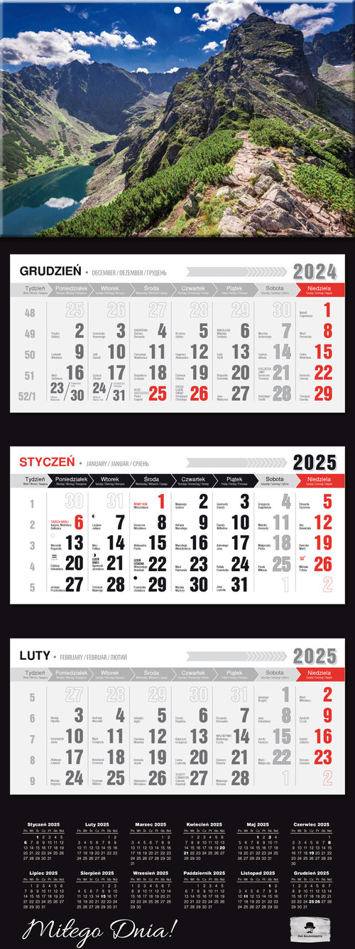 Kalendarz Trójdzielny PREMIUM Z WYPUKŁĄ GŁÓWKĄ. Format 315/810mm. Trzy komplety klasycznych kalendariów z przesuwnym okienkiem. Główka z otworem wierconym. Dodatkowo nazwy miesiąca i dni tygodnia w języku Ukraińskim, Angielskim i Niemieckim. Kalendarium dodatkowo zawiera fazy księżyca i znaki zodiaku. Dużo miejsca do notowania, czytelne duże litery i cyfry. DODATKOWO PRZEDŁUŻONE PLECKI KOLOREM DOPASOWANE DO WZORU ZE SKRÓCONYM KALENDARIUM NA ROK 2025.