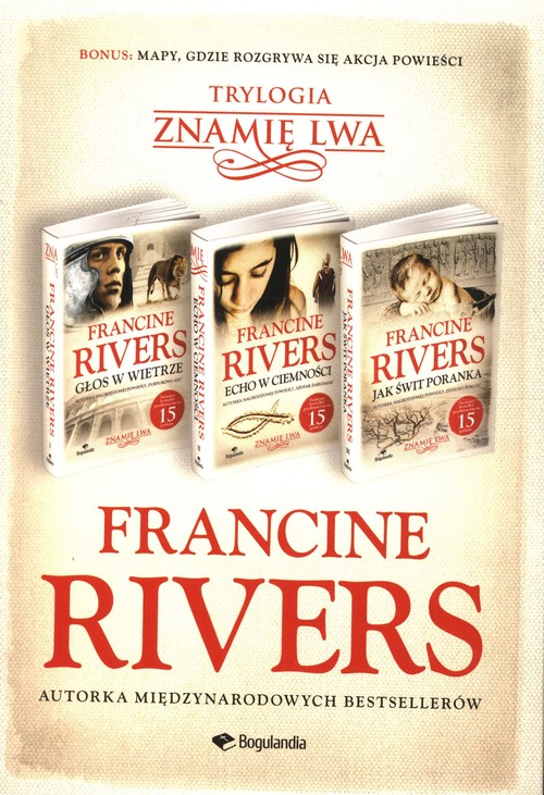 Trylogia "Znamię lwa" w ładnym kartonie BOX-ie Bonus mapa terenów gdzie rozgrywa się akcja powieści. Trylogia „Znamię lwa” zajmuje bezsprzecznie nr 1 w moim rankingu najlepszych powieści. Po prostu cudowna powieść! Największym atutem i sekretem tej książki jest to, że czytając ją, człowiek czuje się „uwznioślony”, podniesiony na duchu, pełen optymizmu i wiary w siebie. Widzi też sens istnienia. Powieść ta winna być polecana jako doskonały lek na depresję, niezwykłe uczucie spokoju wewnętrznego, pogoda ducha pozostają bowiem w człowieku jeszcze długo po ukończeniu czytania. Jedyny minus tej trylogii to fakt, że przeczytawszy jej trzy tomy, żałujemy niezmiernie, że to już koniec. "Głos w wietrze" - I tom trylogii - Francine Rivers - "Znamię lwa" To jedno z największych osiągnięć beletrystyki chrześcijańskiej ostatnich lat. Subtelnie nakreślone portrety psychologiczne, pasjonująca od pierwszych stron fabuła, sugestywnie przedstawiony starożytny Rzym, zaskakująco podobny od współczesnego świata z wszystkimi jego zagrożeniami. "Echo w ciemności" II tom trylogii - Francine Rivers "Znamię lwa" I wiek po Chrystusie. Efez. Młoda chrześcijanka Hadassa zostaje skazana na męczeńską śmierć. Zrozpaczony Markus Walerian podąża do Jerozolimy, by znaleźć Boga, w którego Hadassa wierzyła tak mocno, że z ufnością i spokojem stanęła na efeskiej arenie. Porywająca akcja, wiarygodne sylwetki psychologiczne, sugestywnie przedstawiony starożytny Rzym, zaskakująco podobny do współczesnego świata - to wszystko złożyło się na sukces powieści, którym jest zarówno popularność wśród czytelników, jak i uznanie krytyków oraz prestiżowe nagrody. "Jak świt poranka" III tom trylogii Francine Rivers "Znamię lwa" Niestety już ostatnia trzecia część trylogii Francine Rivers "Znamię lwa". Atretes wódz germańskiego plemienia Chattów wzięty do niewoli przez zwycięskich Rzymian zyskuje sławę niezwyciężonego gladiatora, walcząc przez długich dziesięć lat na arenach Imperium Romanum o wolność. Odzyskawszy ją postanawia wrócić do Germanii. Ale najpierw musi odnaleźć syna, którego uratowała od śmierci młoda chrześcijanka Hadassa zanosząc chłopca do świętego Jana Apostoła...Jak splotą się losy Artesa, Hadassy i Markusa Wybierz się w podróż do Rzymu z I wieku w tej klasycznej serii i odkryj, co zainspirowało miliony czytelników na całym świecie. FRANCINE RIVERS - jedna z najpopularniejszych pisarek amerykańskich, autorka ponad 20 bestsellerowych powieści, przetłumaczonych na dwadzieścia języków, m.in. trylogii: „Głos w wietrze", „Echo w ciemności", „Jak świt poranka". Zdobyła liczne nagrody i zaszczyty, w tym Christy Award, za stworzenie inspirującej fabuły o charakterze historycznym, złoty medal Amerykańskiego Stowarzyszenia Wydawców Chrześcijańskich ECPA za powieść „Ostatni zjadacz grzechu" (zekranizowaną przez Michaela Landona). W 2010 roku książki Francine zostały uznane za najlepiej sprzedające się tytuły na liście „New York Timesa".