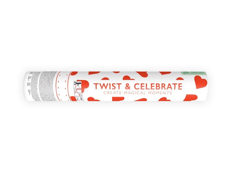 Tuba strzelająca bibułowymi sercami w kolorze czerwonym, długość 28 centymetrów.