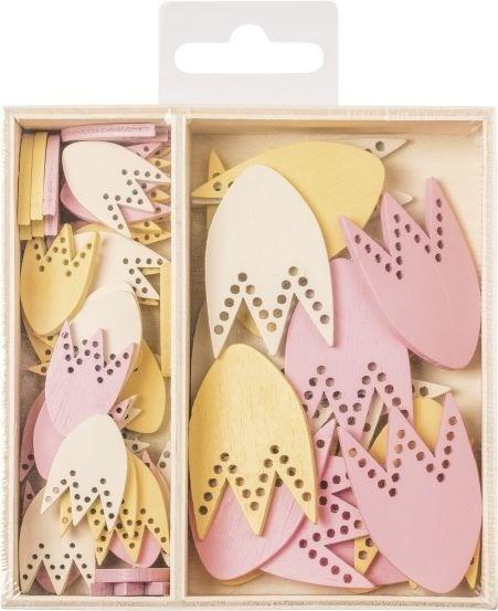 Drewniane pudełeczko z 54 elementami drewnianymi - tulipany w trzech kolorach, w dwóch rozmiarach 2,5 cm i 4,2 cm.