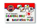 Komplet tuszy KOH-I-NOOR, 6 kolorów, butelki zawierają po 20 gram tuszu, kolory: czarny, brązowy, niebieski, zielony, czerwony i żółty. Kolor czarny jest permanentny, pozostałe są transparentne. Kolory odporne na światło, bardzo dobrze i trwale łączą się z podłożem, jednakże w zależności od podłoża można je korygować np. poprzez drapanie. Można je stosować do piór i pędzli. Przeznaczone do celów kreślarskich, grafiki, kaligrafii, artystycznych jak i ozdobnych.
