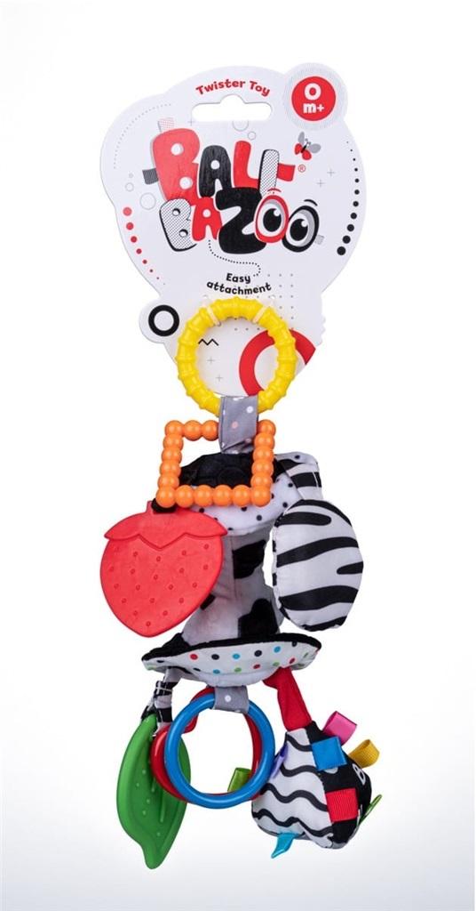 Kontrastowa zabawka, której kształt pasuje idealnie do rączki malucha. Kryje się tu mnóstwo niespodzianek, a wśród nich kolorowe gryzaczki w soczystych kolorach, piszczałka, grzechotka i tasiemka do przeciągania zabawki w dwie strony. Zróżnicowane faktury materiałów pobudzają zmysły dotyku i wzroku dziecka, zachęcając je do odkrywania świata.