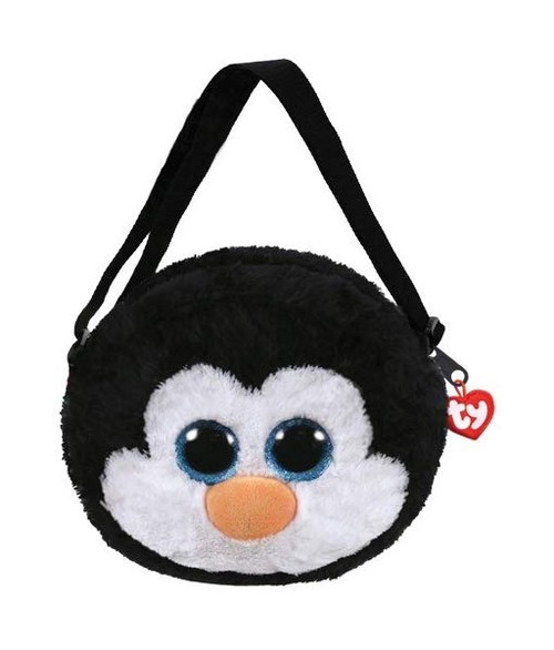 Torebka na ramię w ksztalcie pingwina z błyszczącymi oczami. Wymiary 18x16 cm.