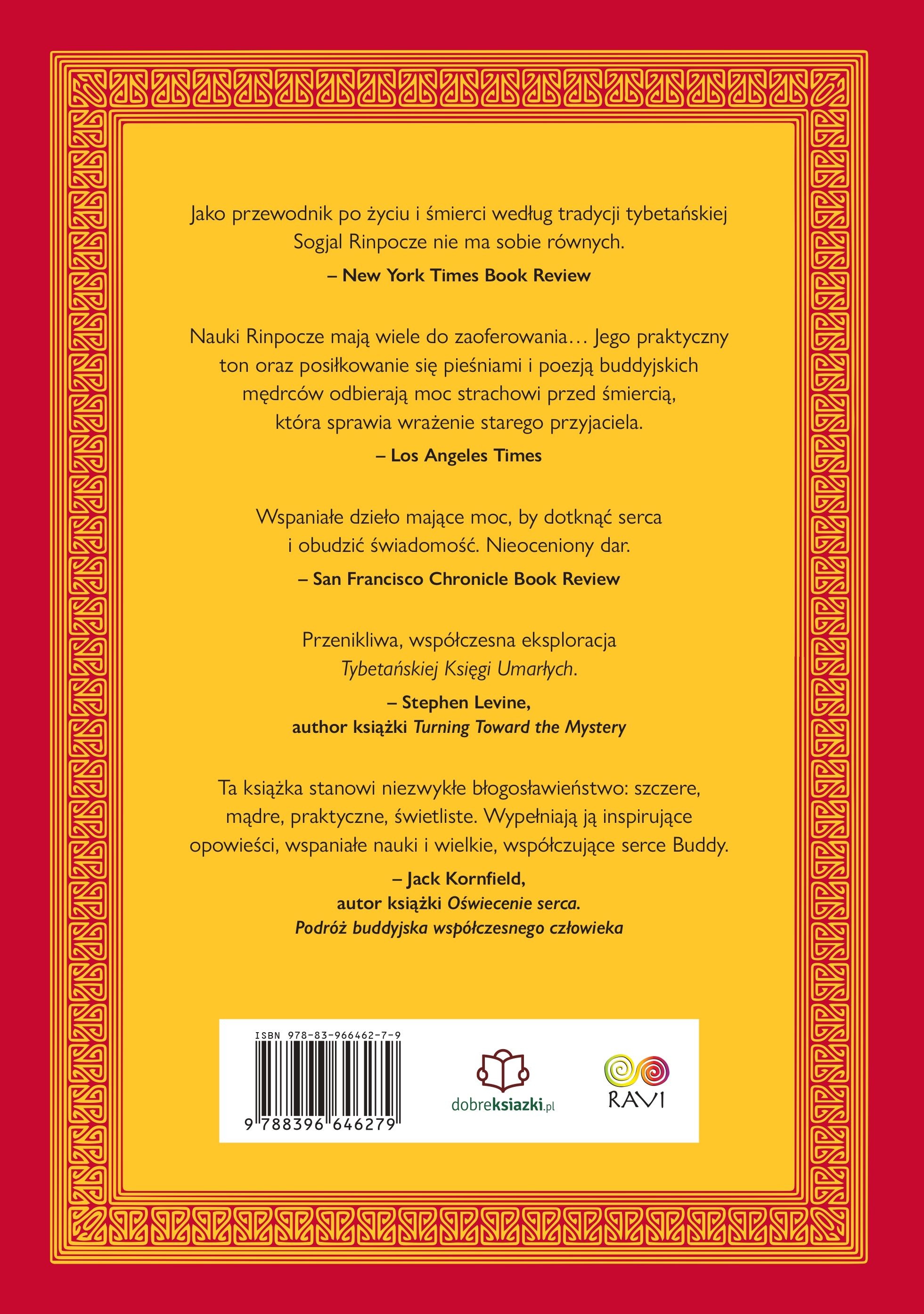 To znane arcydzieło duchowe jest powszechnie uważane za jedną z najbardziej kompletnych i autorytatywnych interpretacji nauk buddyzmu tybetańskiego, jakie kiedykolwiek powstały. Tybetańska księga życia i umierania, będąca przewodnikiem po życiu i śmierci oraz wspaniałym źródłem świętej inspiracji płynącej prosto z serca tradycji tybetańskiej, stanowi przejrzyste i inspirujące wprowadzenie do praktyki medytacji, zgłębiania natury umysłu, karmy i odrodzenia, do współczującej miłości i troski o umierających, a także wyzwań i odpłat, jakie napotykamy na naszej duchowej ścieżce. Sogjal Rinpocze, buddyjski mistrz medytacji i znany na całym świecie nauczyciel, łączy starożytną mądrość Tybetu ze współczesnymi badaniami nad śmiercią i umieraniem oraz nad naturą wszechświata. Tybetańska księga życia i umierania wyjaśnia w niespotykanym dotąd zakresie majestatyczną wizję życia i śmierci, która leży u podstaw klasycznego świętego tekstu Tybetańskiej Księgi Umarłych. Sogjal Rinpocze przedstawia proste, ale potężne praktyki, które może zastosować każdy, aby odmienić swoje życie, przygotować się na śmierć i pomóc umierającym, niezależnie od wyznawanej religii i pochodzenia