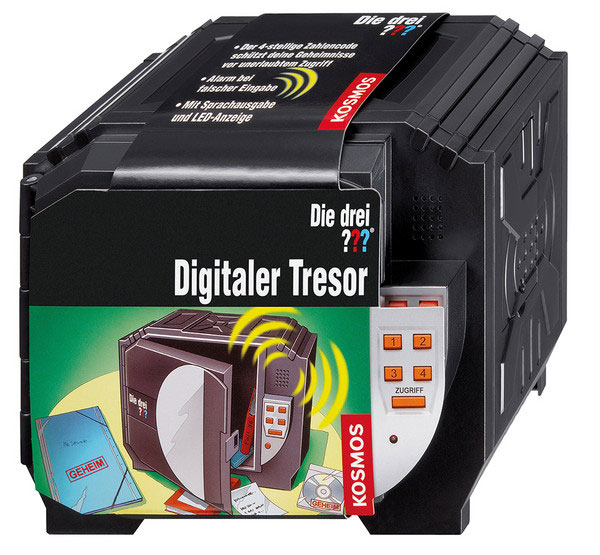 W Rocky Beach w Kalifornii mieszka trójka detektywów: Justus Jonas, Peter Shaw i Bob Andrews. Razem działają jako Tych Trzech ??? i przyjmą każdą sprawę! Trzej przyjaciele przeżywają ekscytujące historie kryminalne, rozwiązują najtrudniejsze sprawy i zawsze mogą na sobie polegać. Poufne dokumenty, małe skarby i inne tajemnice - nie tylko Trzej Detektywi z Rocky Beach, Justus Jonas, Peter Shaw i Bob Andrews, potrzebują bezpiecznego miejsca do przechowywania - nie. Wszystkie dzieci chcą zachować pewne rzeczy dla siebie. Ten cyfrowy sejf jest idealnym sekretnym schowkiem i chroni wszystkie ważne skarby przed intruzami za pomocą czterocyfrowego, indywidualnie ustawianego kodu. W przypadku nieautoryzowanego dostępu alarm ostrzega o włamaniu. Sekrety oznaczają dla dzieci coś magicznego i ekscytującego. Po pierwsze, tajemnice są czymś całkiem prywatnym. Następnie łączą ludzi, których łączy wspólny sekret. Dzieci uwielbiają tajemnice, ponieważ pomagają oddzielić się od świata dorosłych. Cyfrowy sejf Tych Trzech Detektywów ??? pomaga dzieciom chronić ich skarby, zapewniając im jednocześnie możliwość ekscytującej zabawy w prawdziwego detektywa.