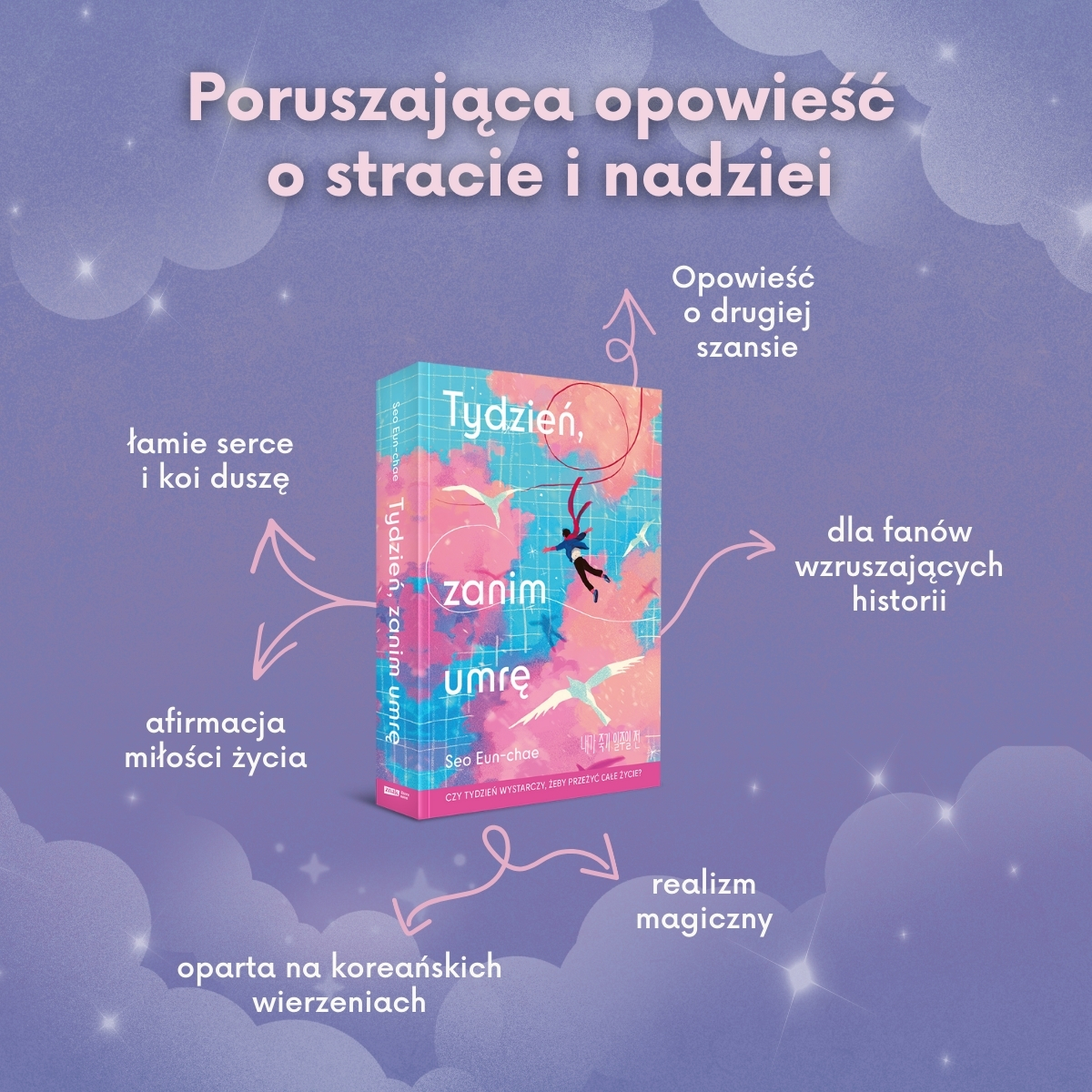 „Tydzień, zanim umrę” to przetłumaczona na 10 języków wzruszająca opowieść o stracie, miłości i drugiej szansie. To historia, która rozdziera serce, daje nadzieję na pogodzenie się z utratą bliskiej osoby i pokazuje, że nigdy nie jesteś tak samotny, jak myślisz.