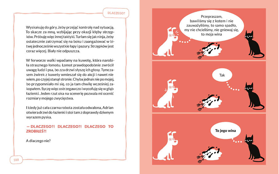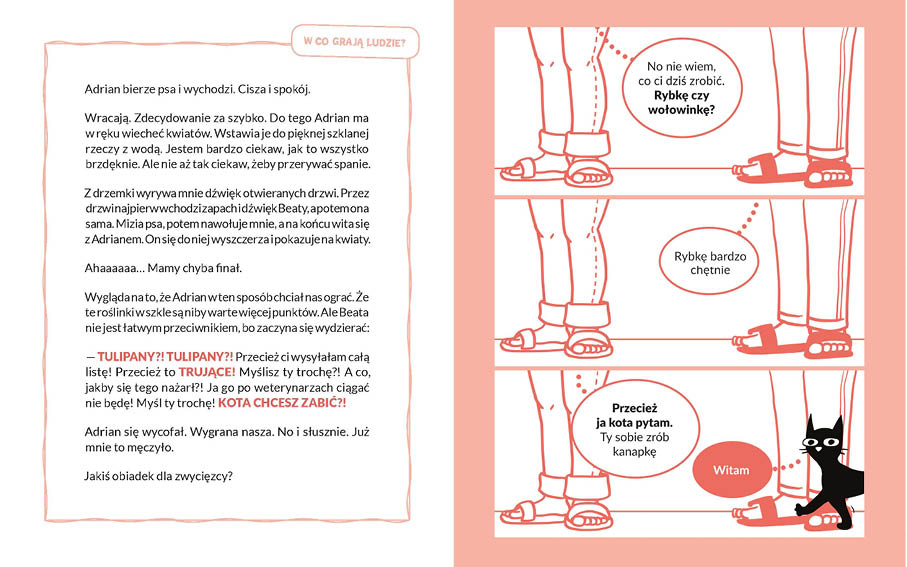 CO MYŚLI NAJBARDZIEJ TYPOWY KOT POLSKIEGO INTERNETU? Ludzie są naprawdę łatwi w tresurze. Jeśli się długo miauczy, zrobią praktycznie wszystko, czego chcesz. Nie żebym ich nie lubił czy coś. Kiedy tak sobie leżę na tych moich ludziach i mnie głaszczą, to sobie jednak myślę, że to jest miłość. Że jednak są bardzo potrzebni, miziają, otwierają puszki z żarciem. No i miziają. Ale z drugiej strony – nie są zbyt kumaci, mówią „kici, kici”, człapią jak pingwiny, mają owłosienie w przypadkowych miejscach i noszą koszulki z nadrukiem. Doprawdy smutne. Nie to co my, koty, najbardziej rozwinięte istoty na ziemi. Te wibrrrysy salonowe, to spojrzenie pełne mądrości i powagi, ten królewski szyk… No i jest też pies. Pies polega na tym, że trzeba go w życiu znosić. Jak by się tu pozbyć dziada?