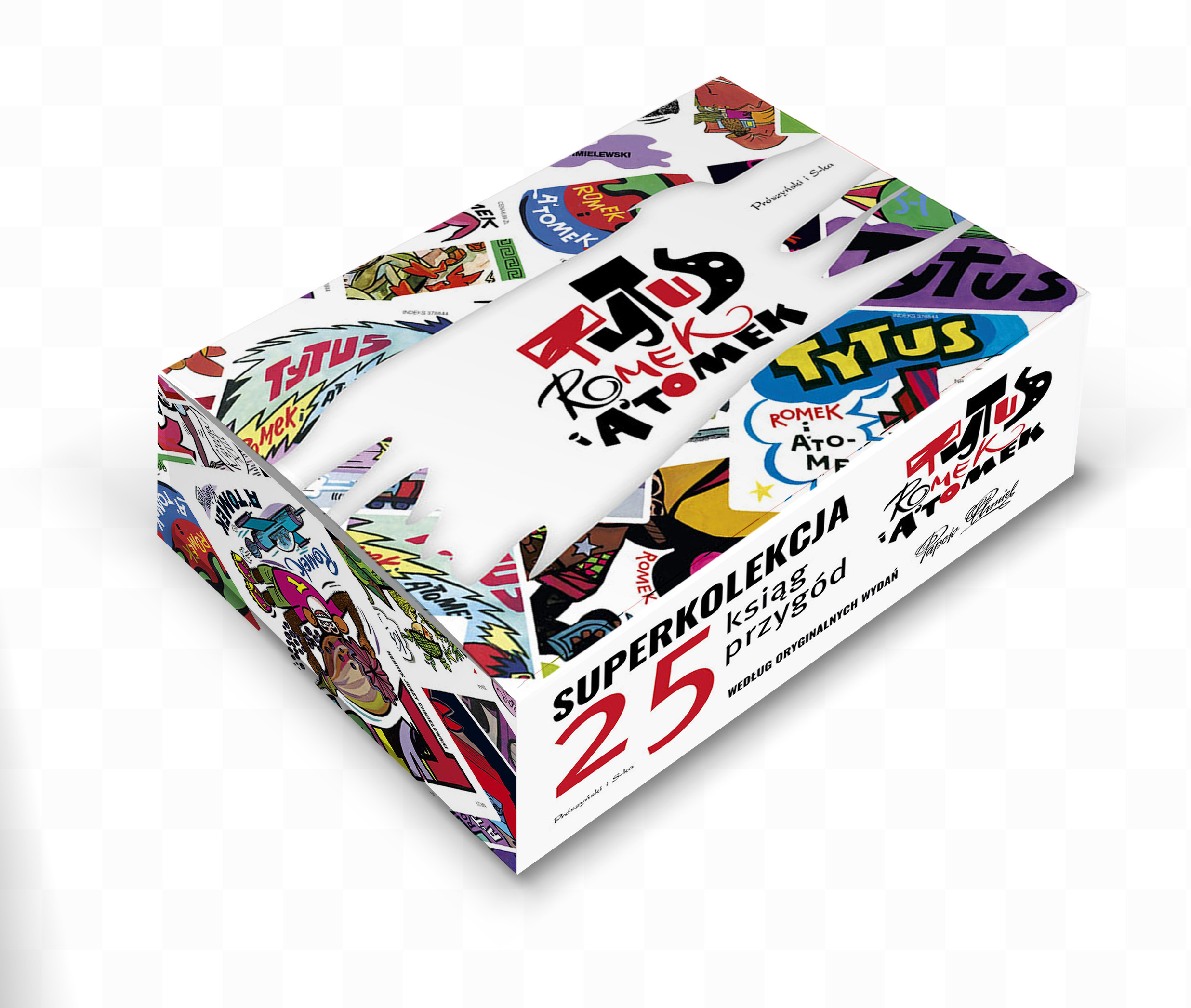 Komplet 25 oryginalnych wydań komiksów z Tytusem, Romkiem i A'Tomkiem, autorstwa Henryka Jerzego Chmielewskiego, zwanego Papciem Chmielem, zebranych razem w kolekcjonerskim pudełku.