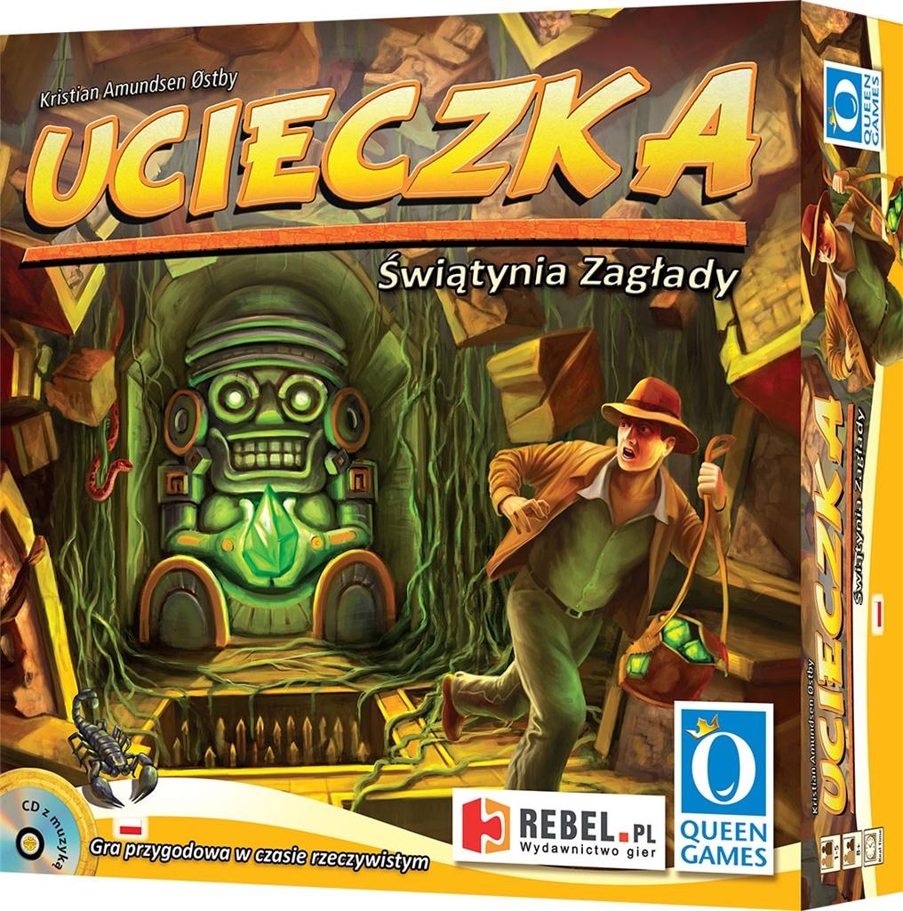 W grze Ucieczka: Świątynia Zagłady uczestnicy rozgrywki tworzą drużynę poszukiwaczy przygód, uwięzionych w przeklętej świątyni. Wspólnymi siłami muszą aktywować magiczne kamienie w komnatach świątyni, celem wypędzenia klątwy. Ważne będą: pomysłowość, determinacja, pośpiech, i przede wszystkim współpraca. Na swej drodze niejednokrotnie spotkacie bowiem wyzwania, którym nie da się sprostać w pojedynkę. Trzeba działać jak dobrze zgrany zespół, bowiem macie zaledwie 10 minut. Po tym czasie świątynia zawali się! Ucieczka: Świątynia Zagłady to niezwykle oryginalna, kooperacyjna gra planszowa, której rozrywka odbywa się w czasie rzeczywistym, bez podziału na tury i wyczekiwania na swoją kolej. Wszyscy działają jednocześnie, starając się sobie nawzajem pomagać i nie panikować pod presją uciekającego czasu. Wykonując rozmaite akcje każdy z graczy rzuca pulą odpowiednich kości, starając się zebrać zestaw wymaganych symboli. Gdy na kostce wypadnie czarna maska, na skutek rzuconego uroku tracimy ją z puli. Odzyskać taką kostkę można wyrzucając symbol złotej maski. Celem graczy jest ucieczka całą grupą z tego przeklętego miejsca, w którym nieszczęśliwym zbiegiem okoliczności się znaleźli. Nieubłaganie uciekający czas odmierzany jest za pomocą nagrania na dołączonej do gry płycie CD. Jak to zwykle w grach kooperacyjnych bywa: wszyscy uczestnicy zabawy wspólnie cieszą się zwycięstwem lub wspólnie ponoszą klęskę (jeśli chociażby jednemu z graczy nie uda się uciec). Dla doświadczonych graczy zestaw zawiera dwa moduły urozmaicające rozgrywkę: Klątwy i Skarby. Dzięki nim gra jest bardziej złożona i wymagająca, a kolejne partie bardziej zróżnicowane. W grze zawarty został także mini dodatek: Piaski czasu, dodający klepsydrę pozwalającą zagrać w przypadku gdy brakuje nam urządzeń odtwarzających dźwięk. Zawartość: - 6 kafelków głównej komnaty - 13 kafelków podstawowych - 1 magazyn klejnotów - 25 magicznych klejnotów - 25 kości - 5 figurek poszukiwaczy - 5 żetonów poszukiwaczy - 1 płyta CD - 1 klepsydra - księga zasad Dodatek: - 13 komnat klątw i skarbów - 14 kart klątwy - 13 kafelków skarbów' - suplement zasad Wiek raczy: 8+ Liczba graczy: 1-5 Czas rozgrywki: 10 minut