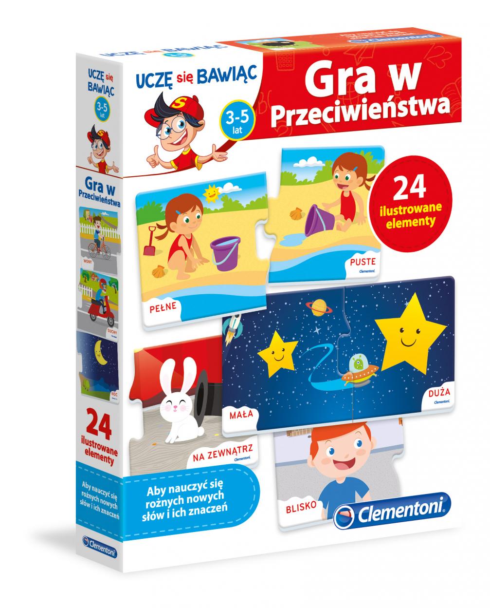 Gra w przeciwieństwa jest prostą i zabawną grą edukacyjną opracowaną po to, by nauczyć dzieci w wieku przedszkolnym różnych słów przy pomocy obrazków ilustrujących pojęcia o przeciwstawnym znaczeniu. Dziecko po odczepieniu elementów od podtrzymującej je ramki powinno przyjrzeć się uważnie każdej ilustracji i dopasować plansze przedstawiające sytuacje o przeciwstawnym znaczeniu. Unikatowe wcięcia pozwalają na autokorektę i umożliwiają samodzielną zabawę. Gra, choć bardzo prosta, spełnia istotną rolę edukacyjną: pozwala na rozwój zmysłu obserwacji i umiejętności logicznego myślenia, a także pomaga dziecku zrozumieć pojęcie przeciwieństwa w odniesieniu do rzeczy, czynności i sytuacji. Zawartość: 12 dwuelementowych mini układanek. Dla dzieci w wieku od 3 do 5 lat.