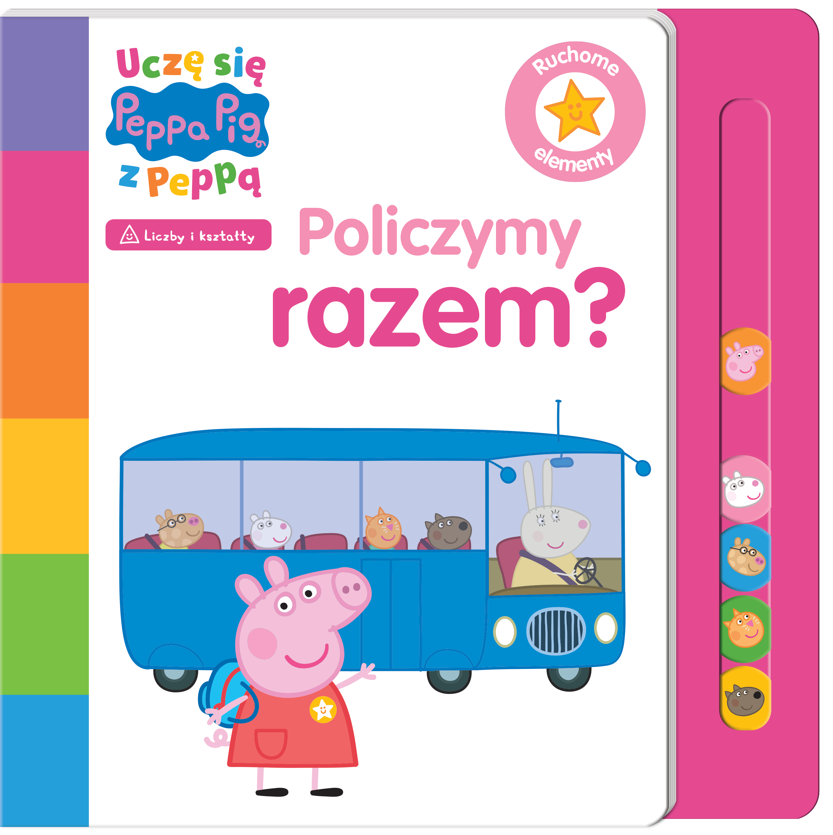 Edukacyjna linia książek, tworząca kompleksowy program edukacyjny dla przedszkolaków, w której ciekawska świnka Peppa zachęca maluchy do wspólnego odkrywania świata i zdobywania nowych umiejętności. Wsiądź do autobusu z Peppą oraz jej przyjaciółmi i ćwicz liczenie do 5. Przesuń znacznik z postacią za każdym razem, gdy kolejny pasażer wsiada do autobusu, i licz, ilu przyjaciół znajduje się już wewnątrz. To nie wszystko!