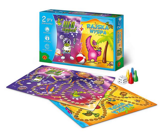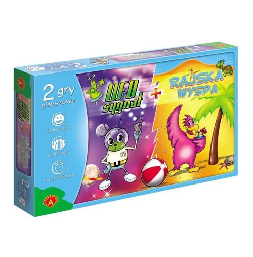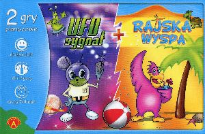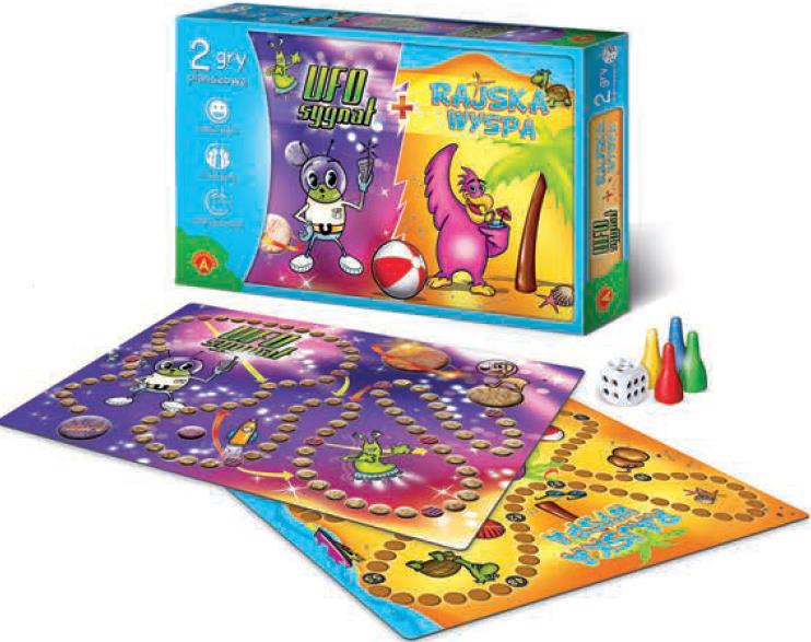 "Ufo sygnał" to gra, w której zadaniem graczy jest pomóc przyjaznemu ufoludkowi odnalezieniu swojego najlepszego kosmicznego przyjaciela, czyli pieska. Po drodze mogą ich spotkać zarówno nieprzewidziane problemy, jak i nieoczekiwana pomoc. Kto pierwszy dotrze do pieska, ten wygrywa. "Rajska wyspa" to gra, w której zadaniem graczy jest podróż na drugi koniec rajskiej wyspy. Po drodze czeka na nich między innymi lot balonem, przejażdżka super - szybką motorówką, czy spotkanie z przyjaznym żółwiem. Kto pierwszy dotrze na drugi koniec wyspy ten wygrywa. Zawartość pudełka: dwustronna plansza, 4 pionki, kostka do gry, instrukcja. Wiek graczy: 5+ Liczba graczy: 1-4 Czas rozgrywki: 25-60 minut