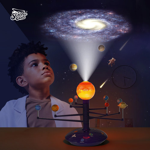 LICENCJA: ScienceCan ILOŚĆ WZORÓW: 1 DOSTĘPNE SERIE:: Space & Technology WYMIARY PRODUKTU: 43 x 18 x 24 cm WYMIARY OPAKOWANIA: 31 x 25 x 11 cm EFEKTY: system solarny na standzie, wmontowany projektor na slajdy, zabawka dźwiękowa - wbudowane opowieści o planetach w języku angielskim i niemieckim, slajdy zawierają 24 obrazki, po naciśnięciu przycisku na standzie układ zacznie opowiadać ciekawostki dotyczące danej planety