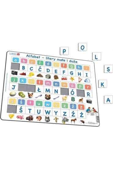 Ta układanka alfabetyczna nauczy dzieci alfabetu, przy użyciu zarówno wielkich, jak i małych liter. Na ramce znajduje się nadrukowany przedmiot zaczynający się od tej samej litery, który pomoże dziecku w nauce fonetyki i wymowy. Pastelowe kolory pokrywające elementy z małymi literami, przyciągną uwagę i zachęcą do zapamiętywania i rozpoznawania. Układanka zawiera 58 elementów z charakterystycznie wykrojonymi krawędziami, z nadrukowanymi wielkimi i małymi literami alfabetu polskiego (którymi mogą zaczynać się wyrazy w naszym języku). Możesz zagrać z dzieckiem w grę memory gdy nie ma żadnych elementów w ramce. Ta układanka jest najbardziej odpowiednia dla młodszych dzieci uczących się alfabetu.