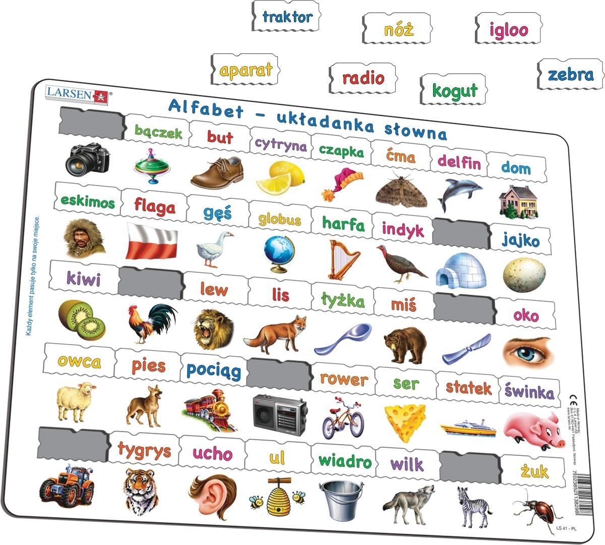 Ta edukacyjna i rozrywkowa układanka zachęca zarówno do czytania, jak i rozpoznawania słów. Nauczysz się czterdziestu słów, odnoszących się do obrazków pokazanych na ramce. Wszystkie słowa w układance są wyświetlane małymi literami i są dość prostymi słowami. Elementy układanki są specjalnie cięte w stylu poziomym i mogą pomieścić słowo składające się z 3-4 liter. Mają postrzępione krawędzie, co nadaje każdemu elementowi niepowtarzalny wygląd jak i wykrojnik, co powoduje, że każdy element pasuje tylko w swoim prawidłowym miejscu ramki. Ilustracje przedstawiają kombinację zwierząt, jedzenia i różnych przedmiotów, które są łatwo rozpoznawalne. Układanka pomoże Twojemu dziecku nauczyć się czytać, a także poszerzyć jego słownictwo i wyobraźnię twórczą, szczególnie w opowiadaniu historii. Ta układanka składa się z 40 elementów i jest przeznaczona dla nieco młodszych dzieci uczących się czytać.