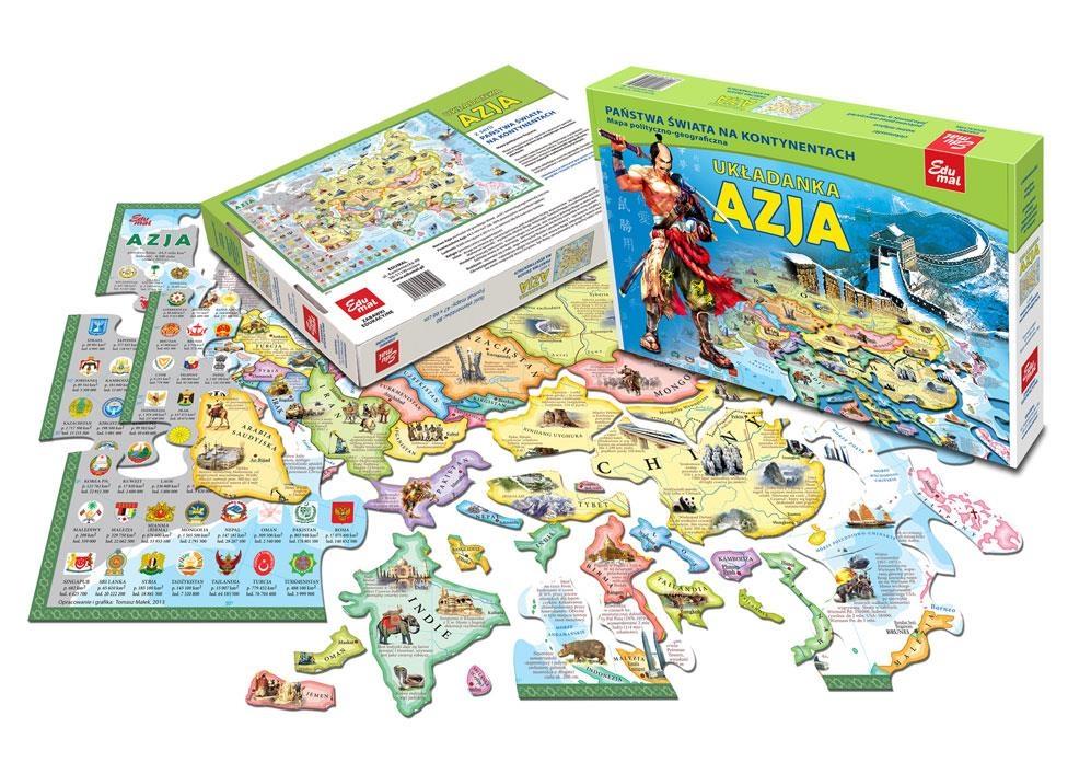 Układanka Azja mapa powycinana jest zgodnie z granicami państw, zatem każde państwo jest oddzielnym elementem układanki.Na mapę nadrukowane są informacje o populacji, powierzchni i herby państw.Zilustrowane i opisane są miejsca ważnych wydarzeń historycznych i ciekawostki geograficzno - przyrodnicze. Osoba układająca uczy się geografii, historii, poznaje kształty państw i umiejscowienie ich na kontynencie. Układanka ta zalecana jest przez nauczycieli geografii i historii jako pomoc w nauce.