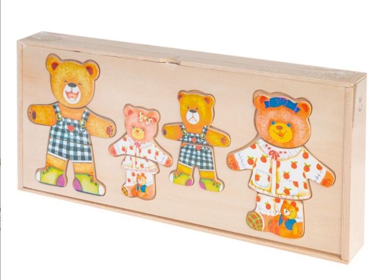Układanka drewniana w drewnianym pudełku pozwala włożyć dużo misiów różnych wielkości. Bużki mają różne miny, pokazują swoje nastroje.