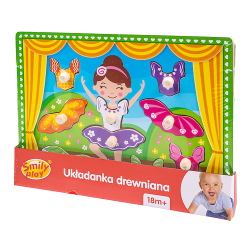 Układanka przedstawia baletnicę i jej stroje. Każdy element ma wygodny uchwyt dla małych rączek, dzięki któremu dziecko łatwo wyjmie i ponownie go dopasuje a jednocześnie utrwala prawidłowy chwyt rączką.