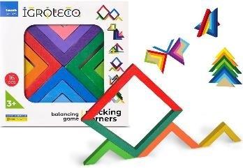 W zestawie: 16 drewnianych elementów w kształcie narożników, w różnych kolorach i rozmiarach, funkcje: możliwość tworzenia płaskich mozaiek, budowanie figur przestrzennych, rozwiązywanie zadań wskazanych na opakowaniu,