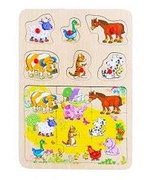 Drewniana układanka z motywem zwierząt domowych. Zabawka zawiera 6 elementów z pinezkami oraz 9 puzzli. Zabawka dla dzieci od 10 m-ca życia