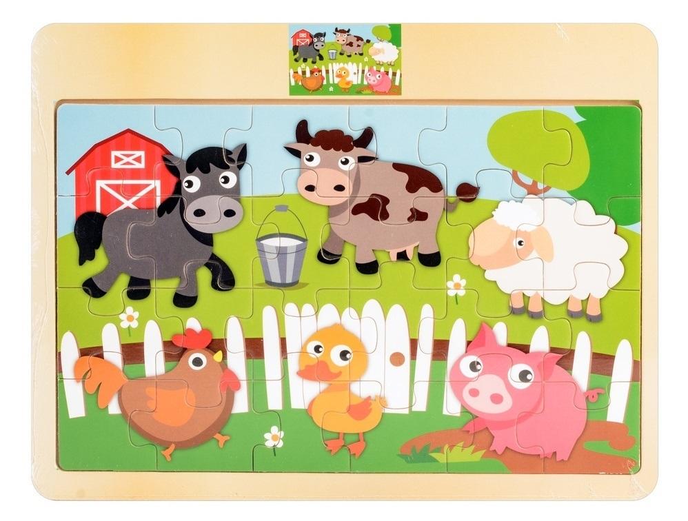 Układanka drewniana na dzieci, rozwija spostrzegawczość, wyobraźnię i koordynację wzrokowo-ruchową. Puzzle składają się z 24 elementów z poglądowym obrazkiem. Produkt przeznaczony dla dzieci powyżej 18 miesiąca życia, posiada certyfikat CE