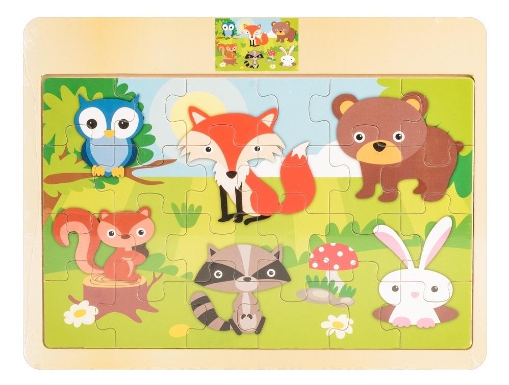 Układanka drewniana na dzieci, rozwija spostrzegawczość, wyobraźnię i koordynację wzrokowo-ruchową. Puzzle składają się z 24 elementów z poglądowym obrazkiem. Produkt przeznaczony dla dzieci powyżej 18 miesiąca życia, posiada certyfikat CE