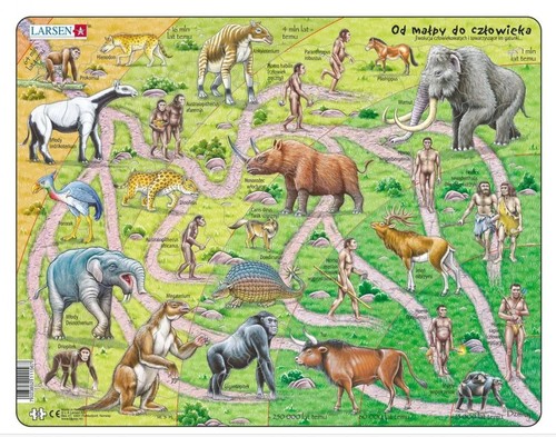 Wybierz się na spacer ścieżką pamięci, podczas gdy my odkrywamy drogę od małpy do człowieka. Ta oszałamiająca i bardzo ilustracyjna łamigłówka zawiera szczegółową i wyjaśniającą ścieżkę czasową od okresu ewolucji małpy do człowieka. W tej układance znajdziesz bezpośrednie ścieżki, które pokazują bezpośrednie relacje na przestrzeni około 65 milionów lat. Jest to zgodne z obecnymi teoriami i odnoszące się do zapisów kopalnych hominidów. Ślad czasu został wyświetlony w 4-krotnym postępie geometrycznym, ukazując nowe życie w różnych etapach. Nazwy każdego zwierzęcia i hominidów znajdują się we właściwych miejscach, zgodnie z przedziałem czasowym przedstawionym na górze i na dole układanki. Wiele z pokazanych zwierząt najprawdopodobniej miało spotkanie z hominidami.