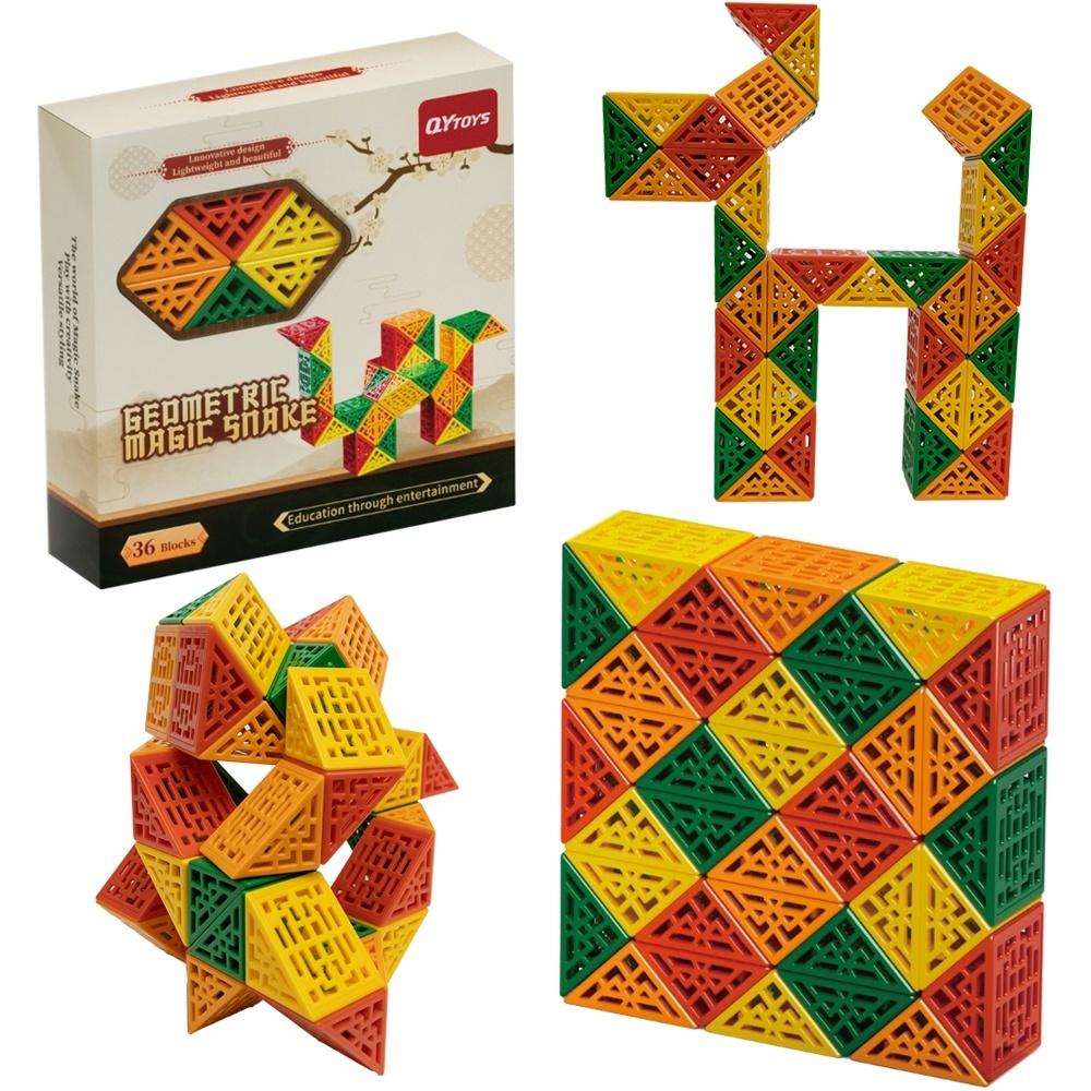 Kolorowa układanka składająca się z 36 elementów, które można obracać i układać w dowolne figury. Dzieci mogą tworzyć węże, zwierzątka, kształty geometryczne i wiele innych konstrukcji.
