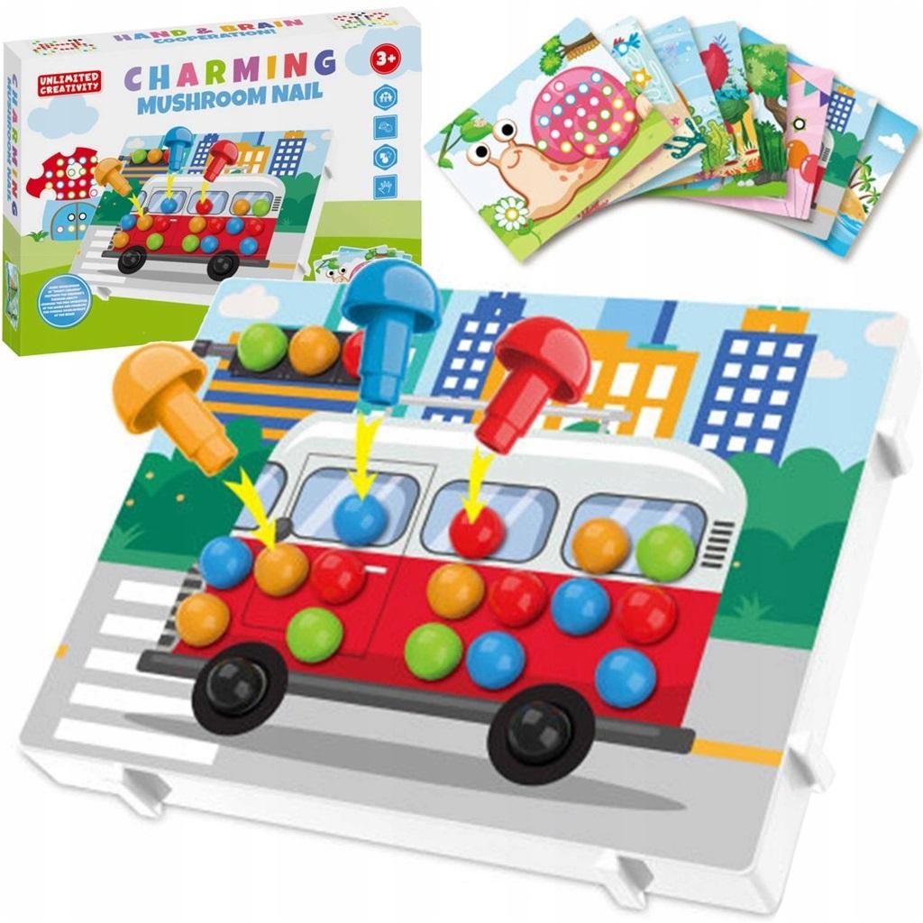 Zestaw zawiera 8 obrazków, 90 guziczków - grzybków w 5 kolorach, plastikowa plansza z dziurkami i specjalnymi zakończeniami - można połączyć kilka podstaw razem. Zabawka rozwija kreatywność, kształtuje wyobraźnię a także rozwój zdolności manualnych. Wygodny plastikowy pojemnik do przechowywania guziczków.