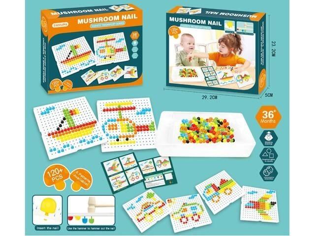 W zestawie znajduje się 110 grzybków: 20 czerwonych, 20 zielonych, 25 żółtych, 20 niebieskich, 20 pomarańczowych, 5 czarnych. Grzybki mają rozmiar 18 cm. Dodatkowo w zestawie znajduje się plansza z dziurkami.