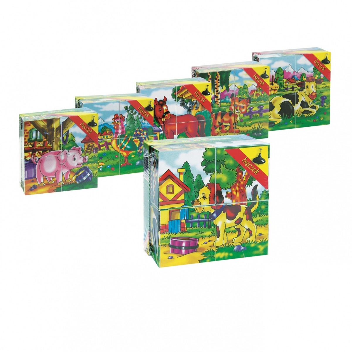 W zestawie znajdują się 4 kostki w kształcie sześcianów. Na każdej ściance klocka naklejony jest inny fragment układanki. Dziecko układając klocki ćwiczy zdolności manulane, pamięć oraz wyobraźnię.