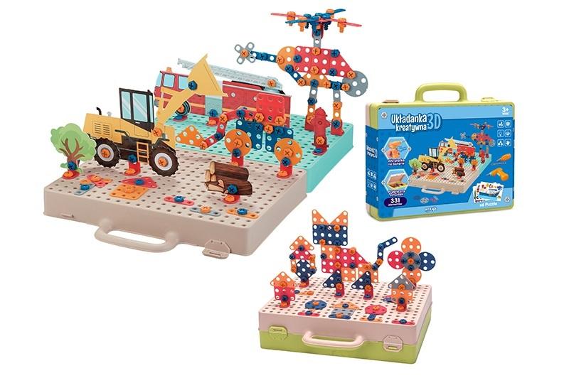 W zestawie: walizka z podstawą na pinezki, wkrętarka na baterie - przykręć, odkręć, śrubokręt, klucz, 120 śrubek, 100 podkładek pod śrubki, 80 łączników, 20 podstawek, 6 kart z elementami do skręcania.