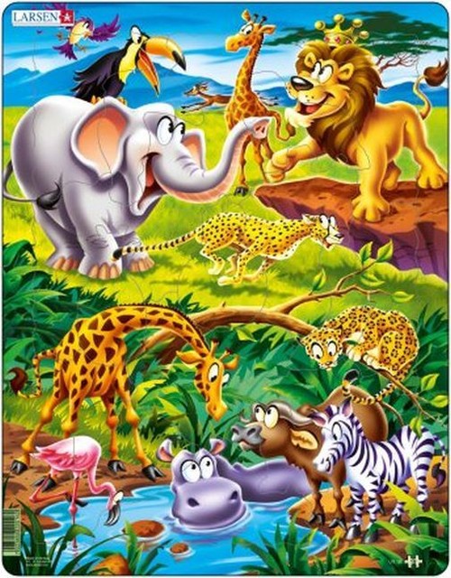 Sawanna jest na wprost tej malowniczej układanki. Puzzle safari ze zwierzętami najlepiej pasują do tych małych rączek, ponieważ składają się z 18 większych elementów. Ta łamigłówka przedstawiająca afrykańskie safari przedstawia słonia, 2 żyrafy, lwa, pelikana, ptaka, 2 gepardy, hipopotama, zebrę, brązowego byka, jelenia i różowego flaminga. Gdy hipopotam pływa w zadowalająco chłodnym basenie, zwierzęta lądowe mogą cieszyć się gorącym słońcem. Ujmująca i przypominająca kreskówkę ilustracja jest skierowana do młodszych dzieci, aby umożliwić im poznanie zwierząt. Niektóre elementy układanki są starannie wykonane i pocięte na kształt ryby, ananasa, gruszki, ptaka i lwa. Czy potrafisz odgadnąć, jakie inne kształty mają elementy układanki?
