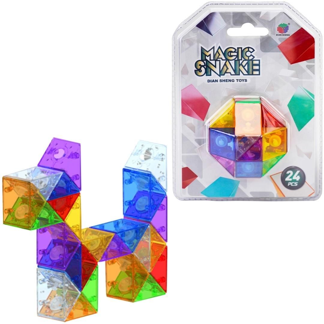 Magiczny Wąż "Magic Snake" - Kreatywna Układanka w Nowym Wydaniu! Odkryj nową odsłonę klasycznej układanki logicznej z naszym "Magic Snake" od DIAN SHENG TOYS! Ta innowacyjna wersja popularnego "Węża Rubika" oferuje jeszcze więcej możliwości twórczej zabawy dzięki przezroczystym, kolorowym segmentom. Cechy produktu: Klasyka w Nowej Formie: To nowoczesne podejście do znanej i lubianej układanki typu "Magic Snake", która pozwala na tworzenie niezliczonych kształtów i figur. 24 Segmenty: Zabawka składa się z 24 połączonych ze sobą trójkątnych segmentów (jak widać na opakowaniu "24 PCS"), które można obracać i składać w dowolny sposób, tworząc zwierzęta, obiekty, geometryczne figury, a nawet abstrakcyjne rzeźby. Przezroczyste, Kolorowe Elementy: Segmenty wykonane są z przezroczystego tworzywa sztucznego w różnych, żywych kolorach (fioletowy, pomarańczowy, zielony, niebieski, czerwony, żółty). Ich przejrzystość dodaje zabawce nowoczesnego wyglądu i fascynującego efektu wizualnego. Rozwój Umiejętności: Układanka doskonale rozwija wyobraźnię przestrzenną, logiczne myślenie, kreatywność oraz zdolności manualne i motorykę małą. Jest to świetne narzędzie do ćwiczenia koncentracji i rozwiązywania problemów. Wysoka Jakość Wykonania: Produkt firmy DIAN SHENG TOYS, znanej z produkcji kostek logicznych, gwarantuje trwałość i precyzję wykonania, co zapewnia płynne obracanie segmentów. Kompaktowy Rozmiar: Układanka jest poręczna i łatwa do zabrania w podróż, zapewniając rozrywkę w każdym miejscu i czasie - idealna na przerwy w szkole, w podróży czy podczas oczekiwania. Atrakcyjne Opakowanie: Zabawka jest zapakowana w estetyczny blister, prezentujący złożoną formę układanki oraz podkreślający jej kolorowy i transparentny design. Wielkość opakowania: 14x19x7 cm Idealna dla: Dzieci i dorosłych w każdym wieku, którzy lubią łamigłówki i wyzwania logiczne. Rozwijania kreatywności i wyobraźni przestrzennej. Prezentu dla miłośników gier logicznych i klasycznych zabawek w nowym wydaniu. Zabawy rozwijającej zdolności manualne i cierpliwość. Pozwól sobie lub swojemu dziecku na godziny wciągającej, kreatywnej zabawy z "Magic Snake" i odkryj niezliczone możliwości kształtowania!