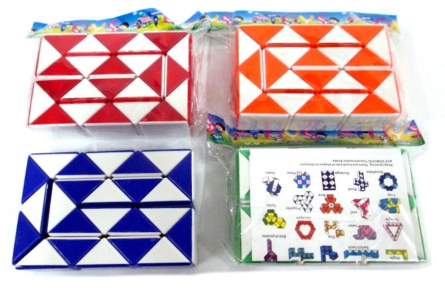 Kostka magiczna wąż. Zadaniem uczestnika jest ułożenie pomieszanej kostki, tak aby znowu doprowadzić do układu zamkniętego sześcianu. Gra umysłowa o średnim poziomie trudności. Kostką można układać różne kształty i wzory. Rozwija intelekt.