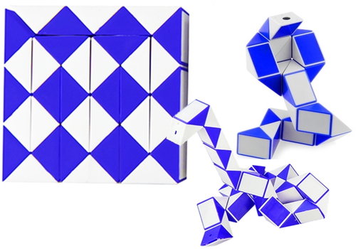 Dwukolorowa układanka, nazywana wężem Rubika, to zabawka logiczna, która sprawi, że każdy zechce trochę pogłówkować. Biało-niebieskie trójkąciki połączone są ze sobą sprężynkami, które umożliwiają wykręcanie elementów w każdą ze stron, jednak nie pozwalają na rozłączenie trójkątów. Jak twierdził Erno Rubik, wynalazca najpopularniejszej kostki, wąż ma nieskończone możliwości konstrukcyjne. Z węża Rubika ułożysz dosłownie wszystko, ograniczeniem jest tylko wyobraźnia. Z użyciem tej układanki stworzysz między innymi rybkę, papugę, rakietę, psa, kość, a nawet serce. Trójkątne elementy ułożone są naprzemiennie w równych rzędach, każdą z kostek można obrócić o 90 stopni w czterech różnych kierunkach. Zabawa z wykorzystaniem układanki Rubika w niesamowicie przyjemny sposób rozwinie umiejętności manualne nie tylko dziecka, ale i dorosłego. Logiczna układanka jest bardzo angażująca, potrafi wciągnąć każdego na długie godziny. Ponadto próba ułożenia węża w wymyślony kształt będzie rewelacyjnym ćwiczeniem wpływającym na cierpliwość, a także wyobraźnię przestrzenną. Ta zabawka ma same zalety. Biało-niebieski wąż Rubika wykonany jest z atestowanego, bezpiecznego tworzywa. Konstrukcja zabawki jest gwarancją komfortu użytkowania, natomiast wykonanie z dbałością o najmniejszy szczegół sprawia, że jest to niecodziennie przyjemna rozrywka. Układanka posiada certyfikat CE, zapakowana jest w przeźroczystą foliowe opakowanie. Wymiary zabawki: - rozłożony wąż: 61,5 cm x 1,5 cm, - złożona kostka: 10 cm x 10 cm x 2,5 cm.