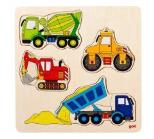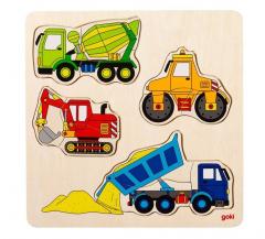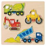 Zadanie polega na ułożeniu 4 różnych maszyn budowlanych Zabawa uczy rozpoznawania wielkości, kolorów i kształtów. Wymiary: 28 x 28 cm Puzzle dla dzieci od 2 roku życia.